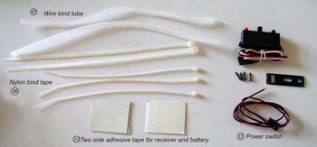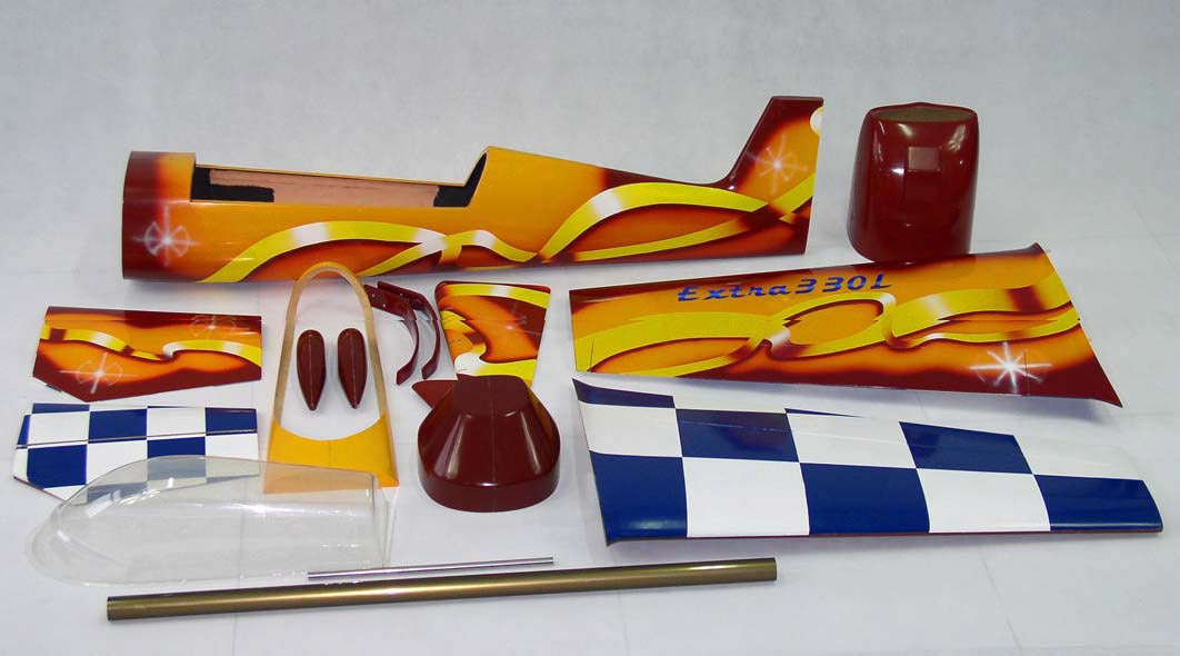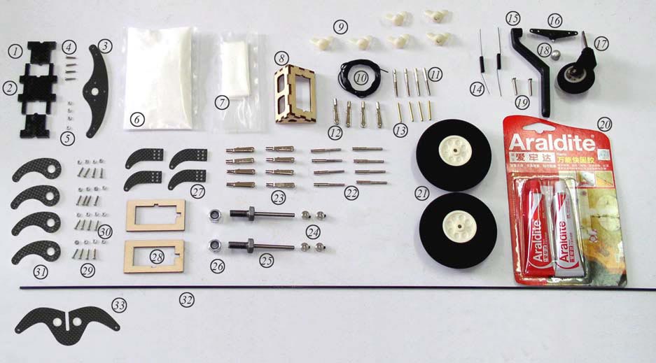 Фюзеляж, руль, руль высоты, фонарь, трубу для крыльев, шасси, обтекатели шасси, аксессуары (колеса и оси, шурупы, рычаги управления)