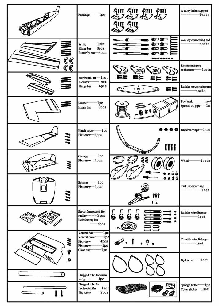 Фюзеляж, руль, руль высоты, фонарь, трубу для крыльев, шасси, обтекатели шасси, аксессуары (колеса и оси, шурупы, рычаги управления)