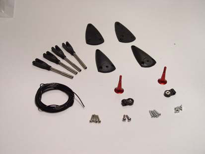 Фюзеляж, руль, руль высоты, фонарь, трубу для крыльев, шасси, обтекатели шасси, аксессуары (колеса и оси, шурупы, рычаги управления)